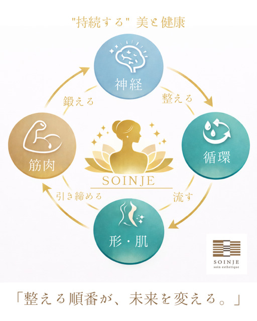 神経→循環→形→筋肉、この順番でケアすることが必要であり、どれか一つだけ整えても本当の意味でより良い変化は続きません。