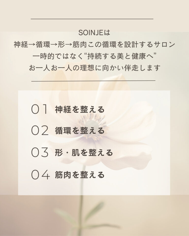 富山でエンダモロジー・VSSをお探しの方へ MENU 神経から整える ” 順番設計型 ” アンチエイジング 美しさは部分ではなく「循環」から生まれます。 SOINJEは、神経→循環→形→筋肉 この順番で整えることで一時的ではなく ” 持続する ” 美と健康を実現します。 SOINJEの順番設計 【1】神経を整える まずは《自律神経》の状態から。疲れやすい、眠れない、産後の体質変化、痩せにくくなった、老化を感じるその根本にあるのは神経の乱れかもしれません。VSSと脳エステで身体のスイッチを整えます。・【初回限定】寝落ちするほど深く整う 脳エステ体験(人気No.1) 定価17,600円 ⇒ 8,000円https://airrsv.net/soinje1111/calendar?schdlId=s0000B9BDB.・【初回限定】深く眠れる体へ。自律神経リカバリーVSS体験定価 22,000円 ⇒ 6,000円https://airrsv.net/soinje1111/calendar?schdlId=s0000B9BDC 【2】循環を整える 整った神経の上で、巡らせる。冷え・むくみ・代謝低下・セルライト・血管消失エンダモロジーで滞った循環を動かします。流れない身体に、美しさは宿りません。・ 【初回限定】巡り目覚めて、体が軽くなる。エンダモロジー循環リセット体験(60分)定価22,000円 ⇒ 6,000円 【3】形・肌を整える 巡った先に、ボディラインが変わり、肌が整う。ここで初めて ” 見える変化 ” が生まれます。・.【初回限定】くすみを脱ぎ捨てる。白玉透明肌フェイシャル体験定価 22,500円 ⇒ 6,000円https://airrsv.net/soinje1111/calendar?schdlId=s0000B9BDF..【初回限定】内側から満ちるハリ。肌再生MPFフェイシャル体験定価 22,000円 ⇒ 6,000円..【初回限定】内側から引き締まる。立体フェイスラインDeep体験定価 28,000円 ⇒ 8,000円..【初回限定】完全貸切、至福のひととき。CIDESCOグレイスフルフェイシャル体験定価 55,000円 ⇒ 27,500円https://soinje2525.com/graceful_facial 【4】筋肉で支える(2026春始動) 最後のピースは「筋肉」25分で全身同時に、寝ているだけで3時間分の筋肉運動。歪みに左右されず、失敗することなく鍛える。だから自然と、美しさが持続する。・【初回限定】鍛えるのではなく整える。◯◯◯◯体験乞うご期待!! あなたはどのタイプですか? 自律神経の乱れを感じている →VSS体験▼初回体験|24時間ネットご予約https://airrsv.net/soinje1111/calendar?schdlId=s0000B9BDC 産後の体を整えたい →神経+循環コースから初回体験|24時間ネットご予約●脳エステhttps://airrsv.net/soinje1111/calendar?schdlId=s0000B9BDB.●VSShttps://airrsv.net/soinje1111/calendar?schdlId=s0000B9BDC 本気でボディラインを整えたい →エンダモロジー集中がおすすめ初回体験|24時間ネットご予約●VSShttps://airrsv.net/soinje1111/calendar?schdlId=s0000B9BDC 将来の衰えが不安 →神経+筋肉強化がおすすめ初回体験|24時間ネット予約●脳エステhttps://airrsv.net/soinje1111/calendar?schdlId=s0000B9BDB.●筋肉強化※2026春始動予定、乞うご期待 相談して内容を決めたい →お気軽にお問い合わせください.●SOINJE 公式LINEhttps://lin.ee/6mARmGA(他の方には見えませんので安心してメッセージください).●お電話 076-424-9500施術中で電話に出られない場合もございます折り返しご連絡させていただきますので留守電にメッセージをお残しください 初回体験について はじめての方は、体質・生活習慣・目的を丁寧に分析します。 今の状態に合わせて最適な順番をご提案します。無理な勧誘はありません。 安心してご相談ください。 SOINJEが選ばれる理由 ✅国際エステティシャン27年 ✅5万人以上のサポート実績✅CIDESCO認可サロン✅商材・マシンは本物志向で厳選「ただ痩せる」ではなく ”整えて、持続させる” それがSOINJEのアンチエイジングです。